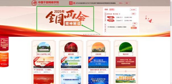 第二步,在中国干部网络学院首页最上方找到并点击“2025年全国两会精神解读”